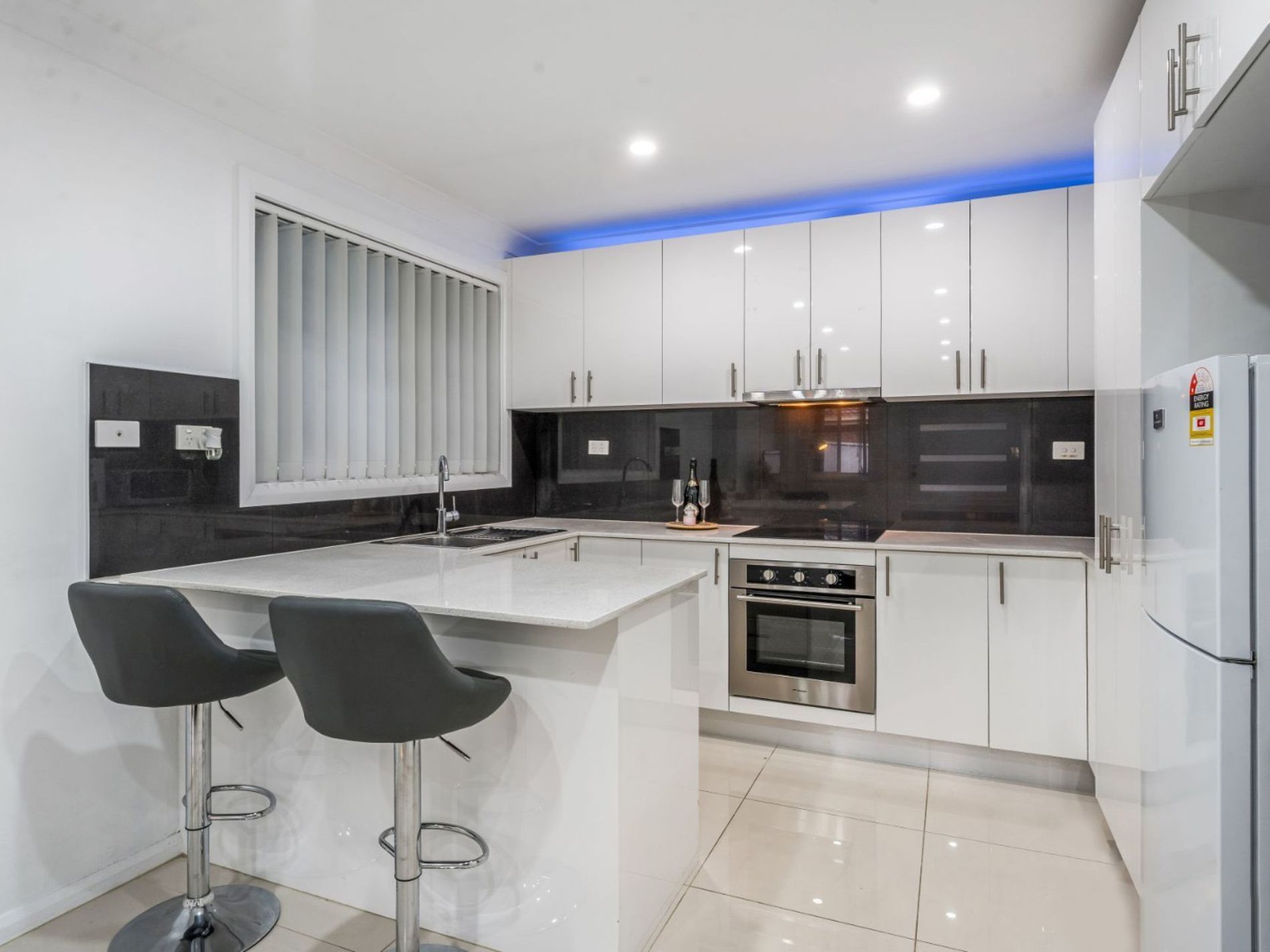 - Modern kitchen with stone benchtops, filtered water system, stainless steel gas cooking appliances, and polyurethane cabinetry